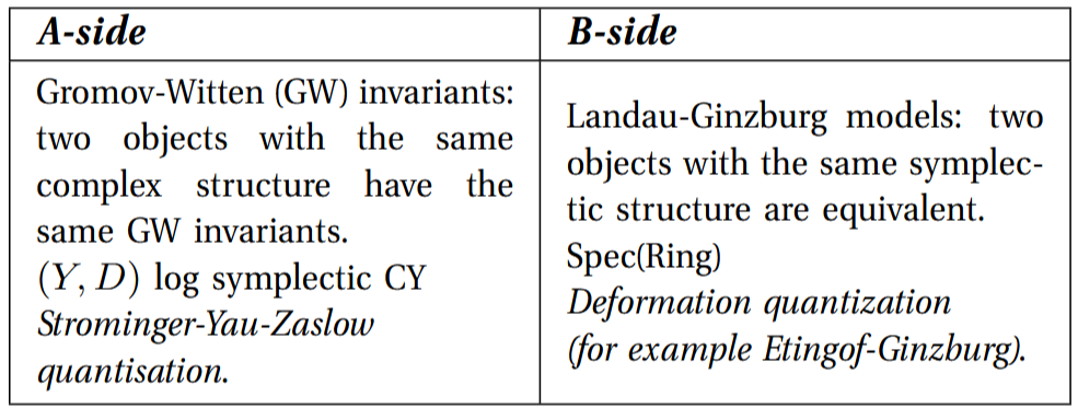 Mirror pairs of CY varieties (compact Kähler manifolds with vanishing first Chern class and Ricci flat metric) are of very different nature but the symplectic geometry of the A-side is reflected in the algebraic geometry of its mirror: