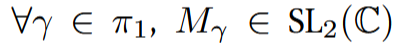 , M_{a}M_{b}M_{c} = M_{0} up to a global conjugation. Thus tr(M) are invariant and x_{i} = tr(M_{i}) for i = a, b, c satisfy a cubic equation: